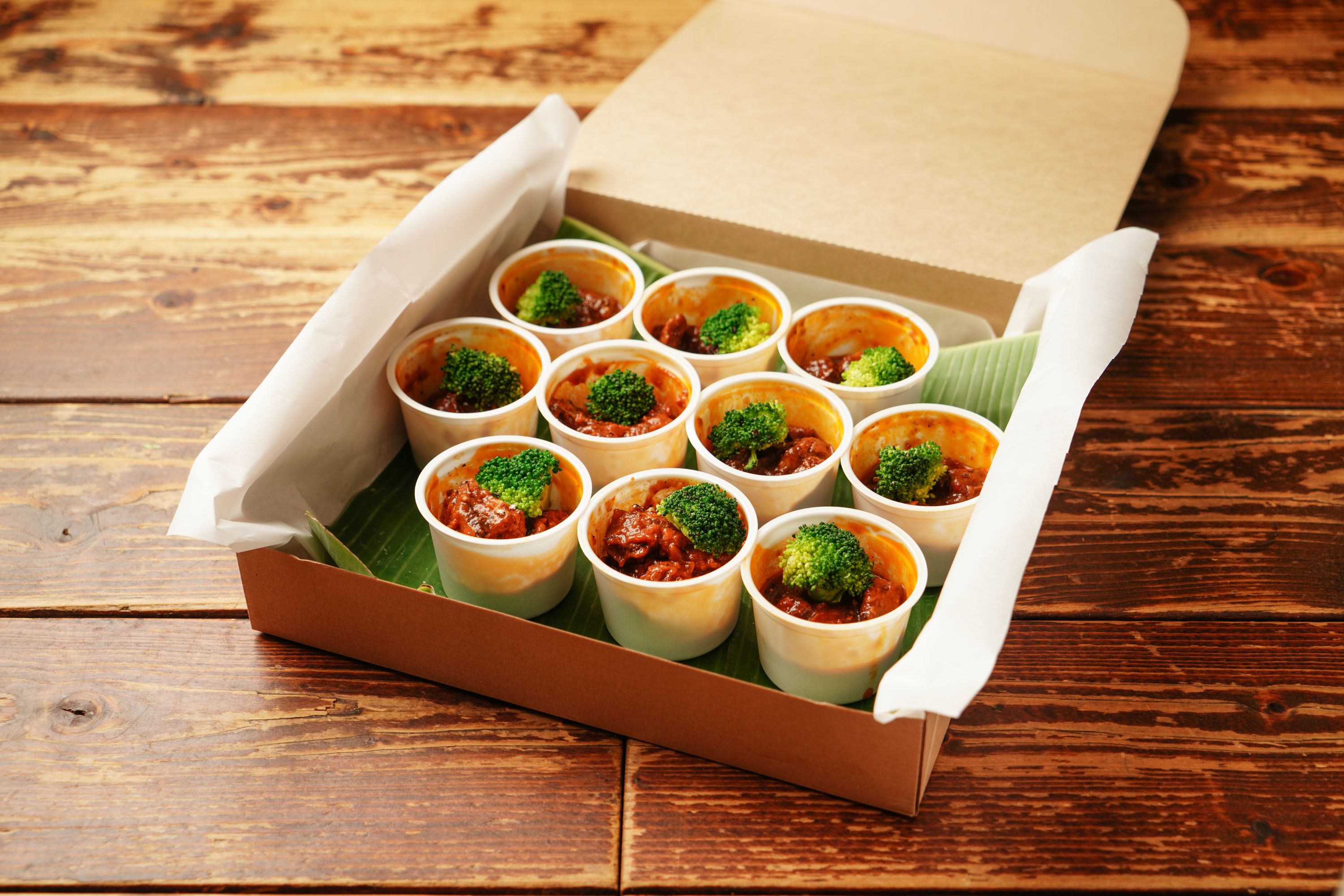 盛り付け済みの容器でお届け。蓋を開けて並べるだけです。 - 備品もフルセット